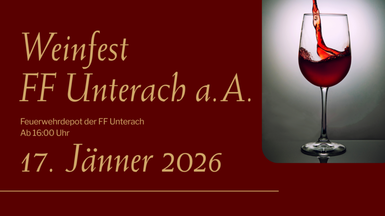 Freuen Sie sich auf Qualitätsweine aus Österreich, Schmankerl- bzw. Heurigenbuffet und musikalische Unterhaltung beim Weinfest im Zeughaus der Freiwilligen Feuerwehr Unterach am Attersee. Der Reinerlös dient zum Ankauf und Erhalt neuer Feuerwehrausrüstung.