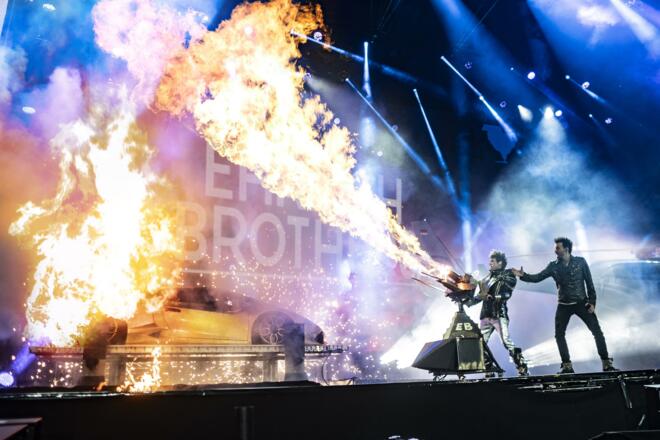 Gleich zu Anfang, wenn sie mit einem Helikopter aus dem Nichts erscheinen, sprengen sie die Vorstellungskraft der Zuschauer. Der perfekt aufeinander abgestimmte Einsatz von Pyro, Licht und Sound macht die Illusionen der EHRLICH BROTHERS zu einem herausragenden Spektakel.