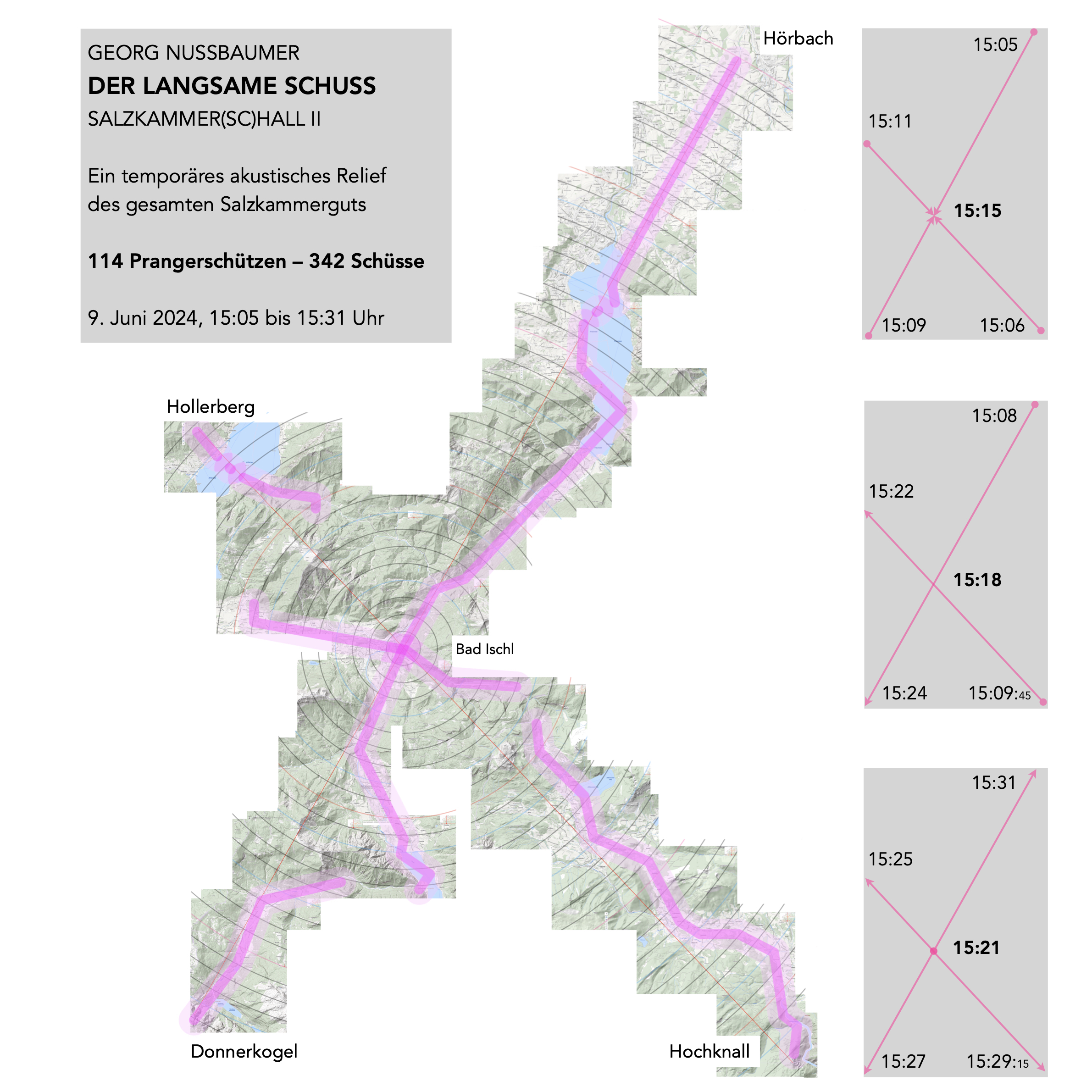 der erste Schuss:Linie Hörbach – Bad Ischl 15:05 – 15:15Linie Hollerberg – Bad Ischl 15:11 – 15:15Linie Donnerkogel – Bad Ischl 15:09 – 15:15Linie Hochknall – Bad Ischl 15:06 – 15:15