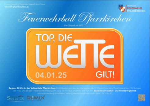 | Preisinformation | EintrittskartenPreis: VVK 15 Euro inkl. kostenlosem Abhol-** und Heimbringdienst Kartenvorverkauf: am 09. Dezember ab 16:00 Uhr beim Punschstand der Bewerbsgruppe vor dem großen Turnsaal der Volksschuleam 23. Dezember von 17:00 bis 21:00 Uhr bei der Friedenlslichtausgabe im Feuerwehrhaus ab 23. Dezember telefonisch unter 0664/73518145. |