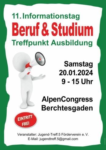 Treffpunkt Ausbildung Für alle Schüler und Jugendlichen, welche noch auf der Suche nach dem passenden Ausbildungsberuf oder Studium sind: hier im AlpenCongress seit Ihr genau richtig.Im AlpenCongress Berchtesgaden stellen sich eine Vielzahl an Betrieben vor. Es bietet sich die Möglichkeit reinzuschnuppern, Fragen zu stellen und Informationen mitzunehmen.