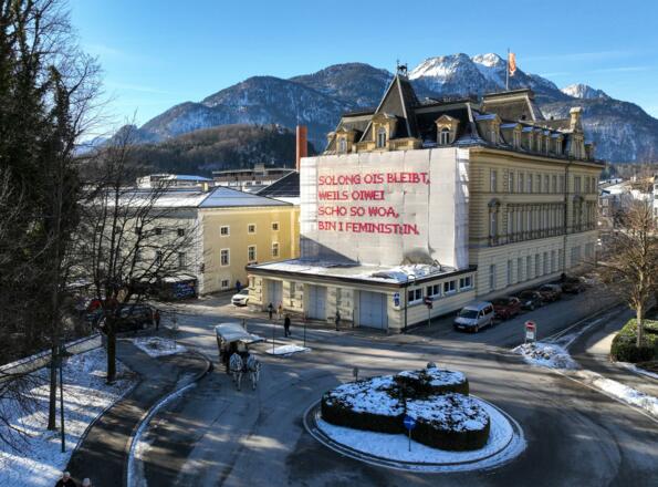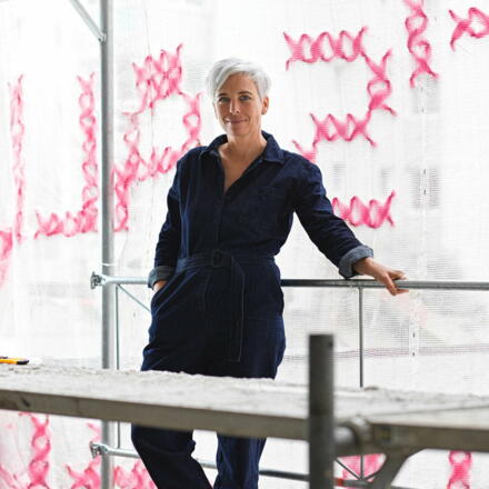 Ein Satz, der mit „SOLANGE…“ beginnt und mit „…bin ich Feminist:in“ endet, wird mit pinkem Tüll im Kreuzstich großformatig auf Staubschutznetze gestickt und an Baugerüste montiert. Das Spannungsfeld entsteht aus der Dynamik zwischen traditionell weiblich konnotiertem Handwerk und männerdominierter Baustelle. Die Künstlerin bricht diese Binarität über die Satzinhalte auf und intendiert einen Brückenschlag zwischen allen Geschlechtern.