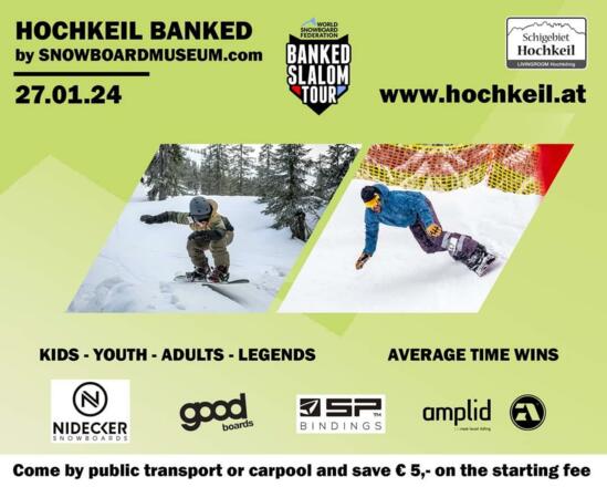 Der Hochkeil Banked lädt wieder zum gemeinsamen Snowboarden ein. Dabei werden Boards aus dem Snowboardmuseum entlang der Strecke präsentiert um die Wurzeln der ältesten Snowboarddisziplin zu feiern. Die Hauptpreise gehen wieder an die Durchschnittszeiten, wobei die Schnellsten auch mit einer kleinen Anerkennung rechnen können. Unser Banked ist teil der WSF Banked Slalom Tour. Snowboarder, Powsurfer und Oldschooler - Kiddies und Omas. Klassen: Kids (bis 9,99 Jahre) Youth (bis 14,99 Jahre) Adult (bis 44,99 Jahre) Legends (4ever). Damen + Herren Wertung! HAUPTPREISE FÜR DIE DURCHSCHNITTSZEIT!