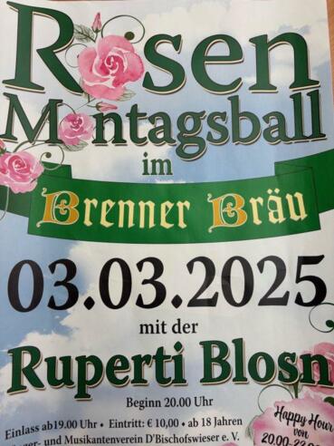 Rosenmontagsball im Gasthof Brenner BräuFür Stimmung sorgt die Band:Ruperti BlosnBeginn: 20.00 Uhr Einlass ab 19:00 Uhr