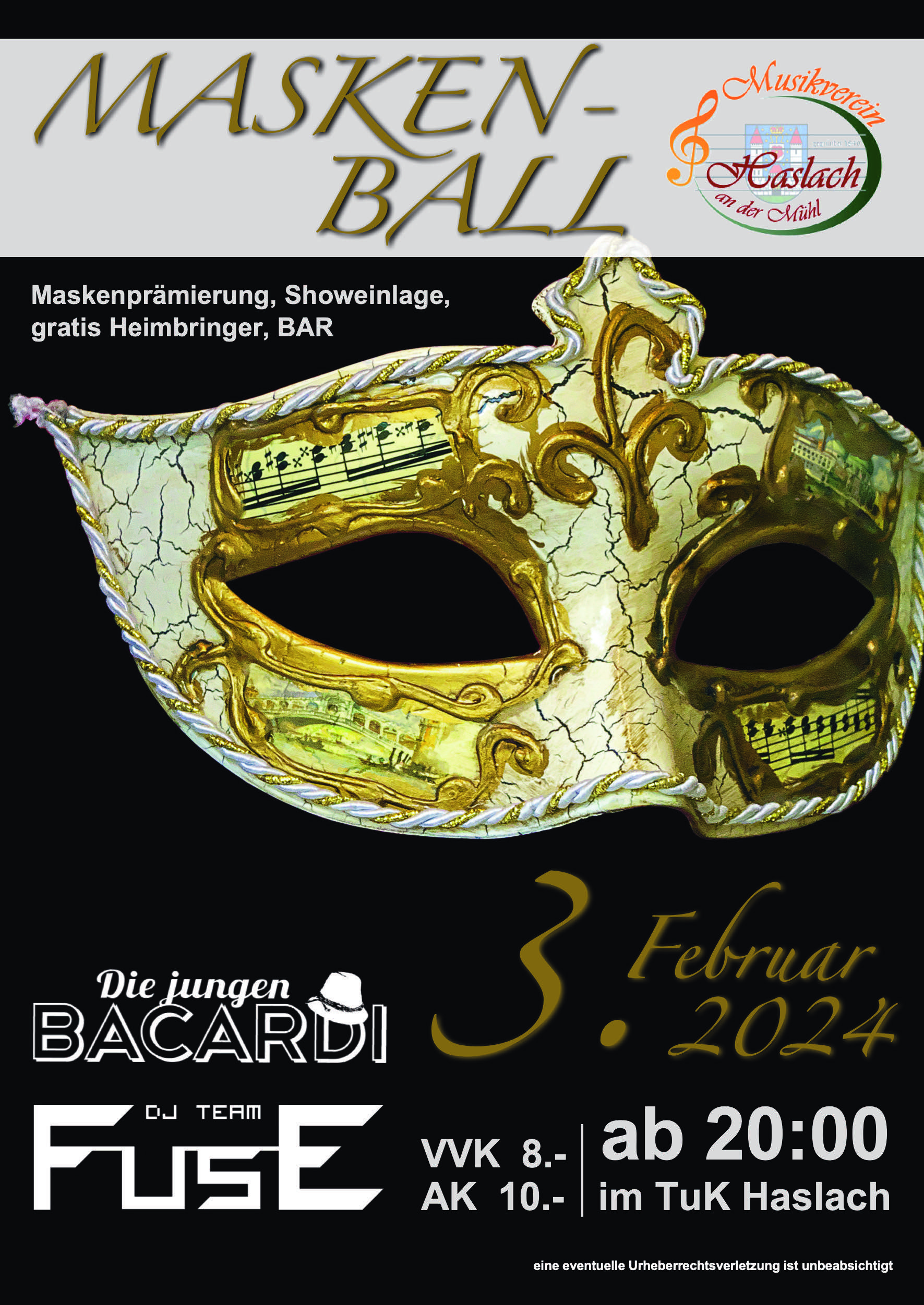 Am Samstag den 03.02.2024 wird es in Haslach wieder lustig – der Musikverein Haslach lädt zum diesjährigen Maskenball im TuK-Haslach ein. Höhepunkt des Abends ist die musikalische Showeinlage des Musikvereins. Auch in diesem Jahr werden die einfallsreichsten und lustigsten Masken bei der Maskenprämierung belohnt.