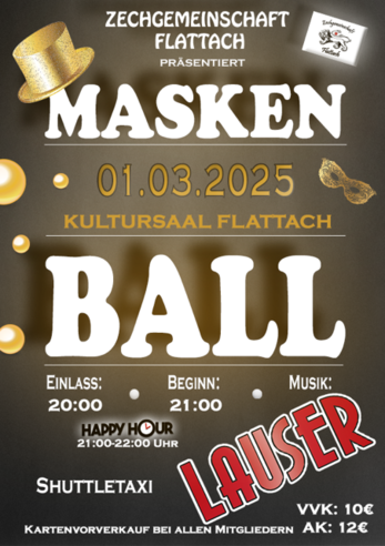 Die Zechgemeinschaft Flattach lädt recht herzlich zum Maskenball im Kulturhaus Flattach ein.