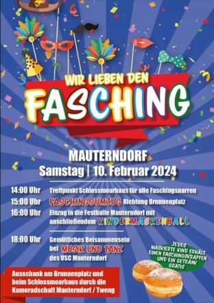 16:00 Uhr Einzug in die Festhalle Mauterndorf mit anschließendem Kindermaskenball