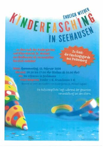 Kinderfasching in Seehausen am Rosenmontag, 12.Februar 2024 von 14.00 - 17.00 Uhr im Gasthof Stern Seehausen.Eintritt: Kinder 1,00 Euro, Erwachsene 2,00 Euro