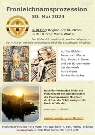 8.30 Uhr Hochamt - HL Messe in der Wallfahrtskirche Maria Wörth danach Fronleichnamsprozession Halbinsel Maria Wörth anschließend Kurkonzert auf dem Freisinger Platz in Maria wörth mit dem Blasorchester Moosburg
