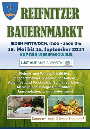 Entdecken Sie am Bauernmarkt die traditionellen "Kärntner Schmankalan", die von den Standlern selbst erzeugt werden. Meist finden Sie hier am Markt auch den Kärntner Honig in diversen Variationen, Schnitzerein und Kunsthandwerk sowie auch Süßes wie Kuchen und andere Mehlspeisen. Nicht fehlen darf natürlich der köstliche Most und Apfelsaft und selbstgebrannte Schnäpse und Liköre. Reifnitzer Bauernmarkt (Webernigareal) - immer mittwochs von 17:00-21:00 Uhr
