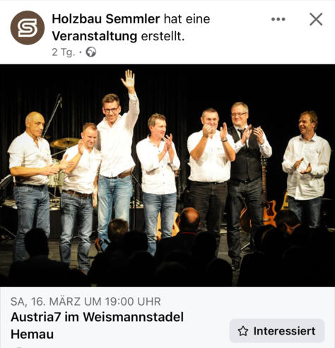 Austria7 – eine Musikband, die sich der Musik der erfolgreichsten österreichischen Liedermacher annimmt. Vor allem die Songs von Rainhard Fendrich, Wolfgang Ambros und Georg Danzer, ebenso bekannt als Austria3, sind zentraler Bestandteil des umfangreichen Programms. Aber auch Falco, EAV, STS, Peter Cornelius und Uli Baer kommen nicht zu kurz. Ein Stück Musikgeschichte und die Erinnerung an die „Gute alte Zeit“ wird jedem vermittelt. Längst vergessene Liedtexte sind auf einmal wieder hergestellt und ermutigen zum Mitsingen.