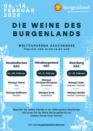 Die Weltcuparena Zauchensee wird vom 6. bis 14. Februar 2025 zum Treffpunkt für Weinliebhaber:innen. Die burgenländischen Weine stehen im Mittelpunkt, mit täglichen Verkostungen von 13:00 bis 18:00 Uhr. Freu dich auf erstklassige Tropfen von Weingütern wie Temer aus Gols, Hoffmann aus Mönchhof, Christian Kirnbauer und Ernst aus Deutschkreutz sowie Jalits und Stubits aus dem Eisenberg-Gebiet.