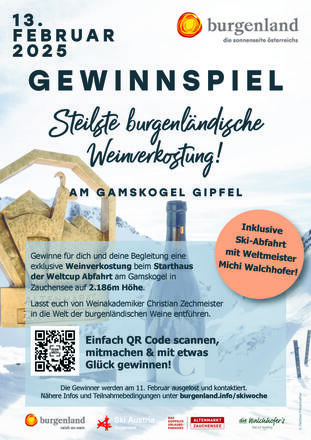 Ein Highlight ist das Gewinnspiel: Gewinne am 13. Februar 2025 eine exklusive Weinverkostung mit Weinakademiker Christian Zechmeister am Starthaus der Weltcup-Abfahrt auf 2.186 m Höhe, inklusive einer Abfahrt mit Skiweltmeister Michi Walchhofer. Die Gewinner werden am 11. Februar ausgelost. Weitere Infos und Teilnahmebedingungen findest du unter burgenland.info/skiwoche.