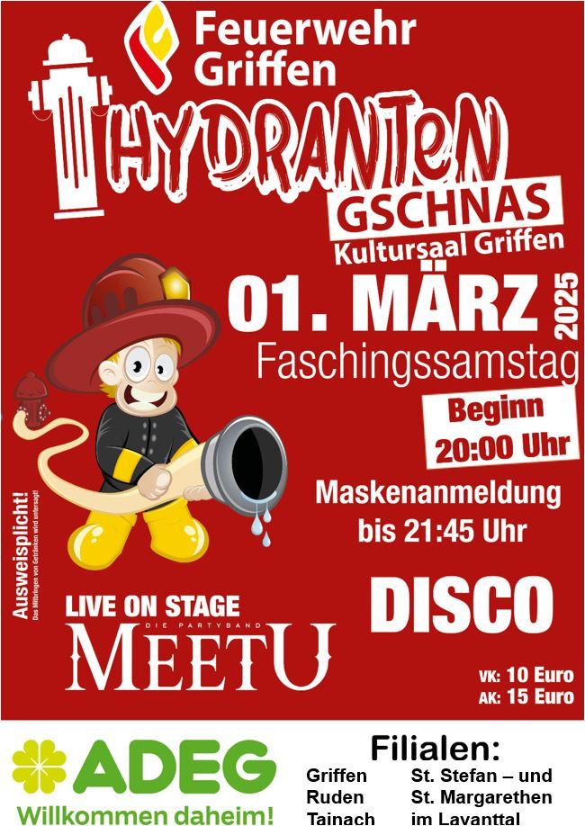 Am 1. März 2025 findet im Kultursaal Griffen das traditionelle Hydratengschnas statt. Die Freiwillige Feuerwehr Griffen freut sich auf zahlreiche Besucher. Großes Highlight ist wie jedes Jahr die Maskenprämierung (Anmeldung bis 21:45 Uhr).