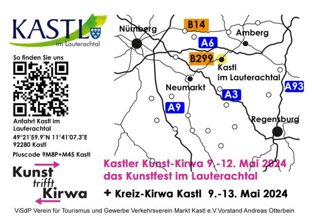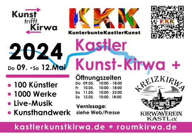 Das Programm der Kastler Kunst-Kirwa 2024 stand bei Redaktionsschluss noch nicht fest und wird in der Tagespresse und unter www.kastlerkunstkirwa.de bekannt gemacht. Der Ausstellungsweg beginnt 2024 bei den „Malerhallen“ (Tankstelle Geitner) und führt über den Skulpturenweg an der Lauterach in den Ortskern von Kastl; einem Brennpunkt der Ausstellung, mit seinen historischen Gebäuden im Osten des Kunstweges und dem Festzelt der Kreuzkirwa im Bäckerstachelgarten neben dem Rathaus. Ein Gegengewicht im Westen schafft die Baradshöfer Dorfgemeinschaft mit ihren großen Scheunen und Hallen in Pattershofen. Mit einem Kunsthandwerker-Markt und weiteren Ausstellern ist der Ortskern Pfaffenhofen in den Weg eingebunden. Es wird wieder ein Kunstfest der Superlative, das weit über die Region der Markgemeinde Kastl hinaus, Besucher anlocken wird.