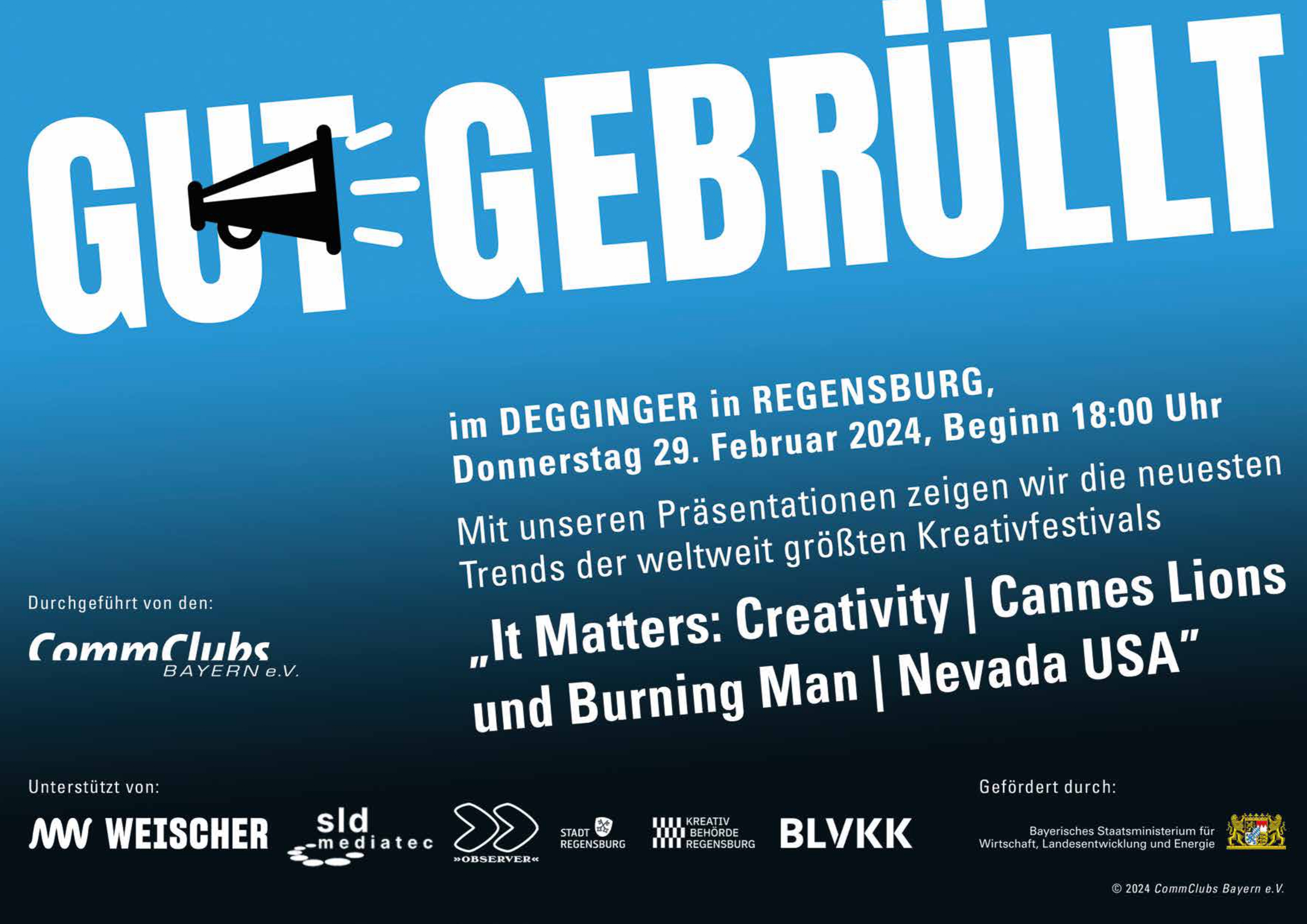Am Donnerstag, den 29.02.2024 werden im DEGGINGER die neuesten Trends der weltweitgrößten Kreativfestivals CANNES LIONS und BURNING MAN präsentiert und im Anschluss das lokale Unternehmen urnfold vorgestellt. Clara Katharina Glaeser (Marketing Manager Strategic Platforms aus Hamburg) gibt neueste Insights rund um das Cannes Lions Festival.