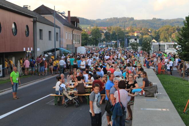 Die Bundesstraße ist an diesem Abend entlang des Donaukais für den Autoverkehr gesperrt, sodass die zahlreichen Besucher die Veranstaltung in einem großzügigen Areal an der Donau genießen können.