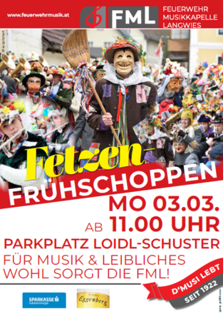 Am Parkplatz vor dem Schuhreparaturgeschäft Loidl lädt die Feuerwehr Musikkapelle Langwies zum FETZEN-FRÜHSCHOPPEN. Ab 11:00 Uhr ist für Musik und das leibliche Wohl gesorgt.