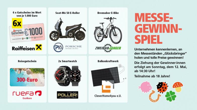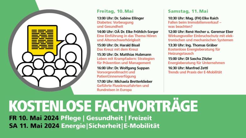 Neben den ausstellenden Unternehmen aus Branchen wie Haus und Wohnen, Sicherheit und Energie, Gesundheit und Pflege sowie Wohlfühlen und Freizeit bietet die Messe tagsüber Fachvorträge, Kinderbetreuung, Kulinarik, ein Gewinnspiel mit Preisen im Wert von 16.000 Euro und einen Vergnügungspark. Freitagnachmittag: Gesundheitsvorträge und unterhaltsame Senior:innen-Lounge; Samstagnachmittag: unterhaltsame Lehrlingsoffensive zum Kennenlernen von Lehrberufen mit den örtlichen Jugendzentren, Lehrbetrieben und „Skills Activity“ der WK Steiermark!
