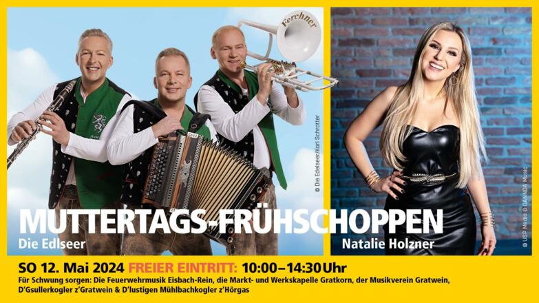 Sonntag, Muttertags-Frühschoppen ab 10 Uhr: Musik und Tanz mit lokalen Gruppen, anschließend Die Edlseer und Natalie Holzner