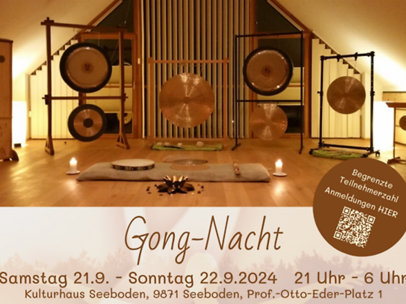 Gong-Nacht im Kulturhaus Seeboden von 21 - 6 Uhr in der Früh. Gong-"Puja" - aus der Fülle geboren". Die Fülle der Klänge ist es auch, die diese besondere Nacht unvergesslich macht. Eine wunderbare Zeremonie mit einer geführten Meditation. Durch die Nacht begleiten sanfte Klangkompositionen mehrerer Gongs, Klangschalen, Monochord und weitere Klangelemente, die reinigend, harmonisierend und erneuernd wirken können. Durch die Nacht führen Gabriele Schumi, Gerhard Hallegger, Tina Kreuzer und Franz Kapeller. Anmeldungen unter Tel.: +43 650 211 77 32. Begrenzte Teilnehmerzahl.