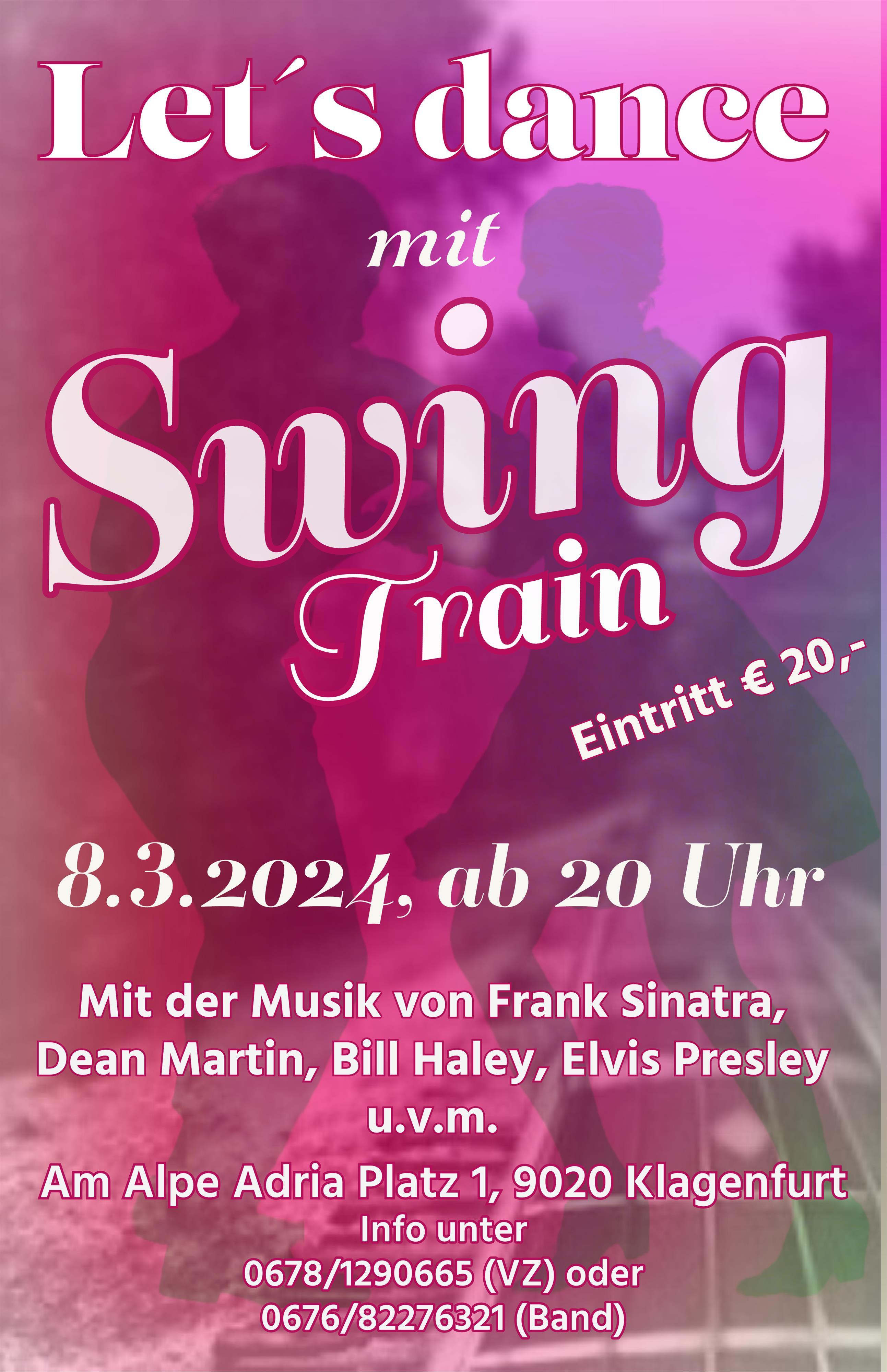Schwingen Sie Ihr Tanzbein mit der LIVE-Musik von Frank Sinatra, Dean Martin, Bill Haley, Elvis Presley u.v.m. interpretiert von der Band "Swing Train" im Veranstaltungszentrum Klagenfurt.