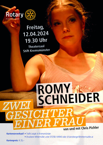 „Ich kann nichts im Leben, aber alles auf der Leinwand“, urteilte Romy Schneider über sich selbst. Chris Pichler schlüpft in diese ernsthafte, ungestüme Künstlerin Romy Schneider, mit Respekt und schauspielerischer Seelennähe und macht den bewegenden und bewegten Lebensweg dieser Ikone der Filmwelt, von den heiteren Sissi-Anfängen bis zu ihrem frühen tragischen Lebensende, nachvollziehbar. Romy bist du es? Chris Pichler lässt den Star, der nicht Sissi sein wollte, mit verblüffender Ähnlichkeit auferstehen. Ein Soloabend, in dem Romy Schneider selbst und persönlich zu Wort kommt.