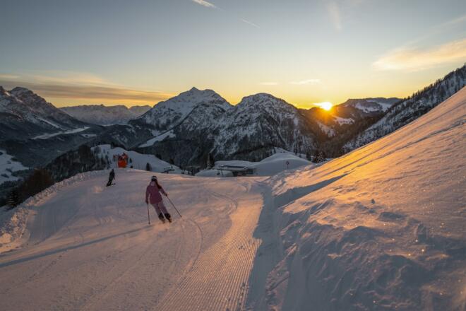 Die magische Morgenstimmung am Berg in Fieberbrunn erleben, den ersten Schwung vor allen anderen auf die unberührten Pisten ziehen und anschließend ein hochwertiges Bergfrühstück genießen: wer von so einem Start in den Tag träumt, sollte bei der First Line in Fieberbrunn dabei sein!
