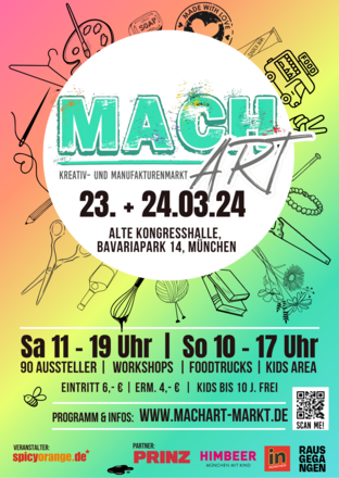 Der MACHart Kreativ- und Manufakturenmarkt findet am 23. und 24. März jeweils von 11-19 Uhr und von 10-17 Uhr in der Alten Kongresshalle, Am Bavariapark 14, statt. Im neofuturistischen Stil des denkmalgeschützten Gebäudes findet sich eine bunte Mischung aus Dingen, mit denen sich der Alltag noch schöner gestalten lässt: Kunst, Mode, Schmuck, Accessoires und Dekoration, Keramik, Papeterie, Babysachen, Kerzen, Taschen, Postkarten, Hundezubehör, Seifen, Spielzeug, Naturkosmetik und vieles mehr. Für alle Foodies gibt es u.a. Chips, Nüsse, Aufstriche, Öl, Senf, Gin, Whisky oder Liköre. Hier darf natürlich auch probiert werden!