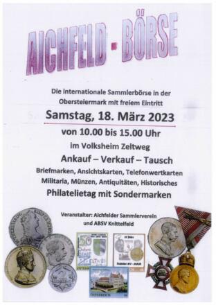 Vom Aichfelder Sammelverein MMM unter Obmann Josef Grillitsch ausgerichtet, hat sich die Aichfeld-Börse mittlerweile zu einem bedeutungsvollen Treffpunkt für alle Sammler aus der gesamten Obersteiermark und darüber hinaus entwickelt und ist für alle Interessierten von 10:00 bis 14:30 Uhr geöffnet.