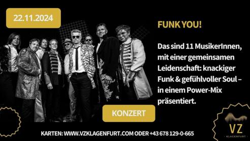 Funk You! Das sind 11 MusikerInnen, mit einer gemeinsamen Leidenschaft: knackiger Funk & gefühlvoller Soul – in einem Power-Mix präsentiert.