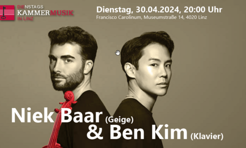 Kammermusikkonzert von Niek Baar und Ben Kim. Sie laden ein zu spannenden und erlebnisreichen Entdeckungsreisen in die Welt von Johannes Brahms, Clara Schumann, Edvard Grieg und Witold Lutoslawski.