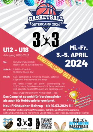 Das Camp ist u.a. als Vorbereitung für das 3x3 Turnier geeigent, welches in Rott zusammen mit dem TSV Wasserburg stattfindet. Termin ist am 15.06.2024 - Anmeldung unter https://www.asv-rott.de/3x3.