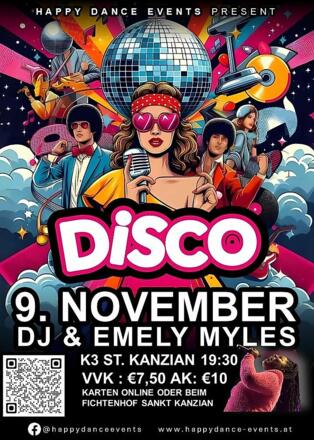 Erleben Sie eine unvergessliche Nacht voller grooviger Beats und mitreißender Melodien bei der Disco Party mit DJ & Emely Myles.