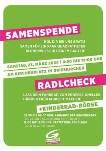Die Grünen Grieskirchen bieten am Samstag, 23. März 2024 von 8.30-12.00 Uhr am Kirchenplatz Grieskirchen wieder einen kostenlosen Radlcheck vom Profi, damit die Radsaison sicher gestartet werden kann. Das Radservice ist kostenlos, bezahlt werden müssen nur die eventuell benötigten Ersatzteile. Zum zweiten Mal findet heuer auch eine Kinderrad-Börse statt. Sollten Sie ein fahrtüchtiges Kinderrad im Keller oder in der Garage stehen haben, dass nicht mehr passt, so können Sie es ab 08:30 Uhr zum Kirchenplatz bringen. Vielleicht finden Sie dort ja auch ein passendes Rad für Ihr Kind. Zu Mittag kann dann entweder das Geld oder, wenn sich kein Käufer gefunden hat, das Rad wieder abgeholt werden.