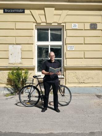 Ebenso wie weiland Anton Bruckner bewegt sich auch David Wagner gänzlich unmotorisiert durchs Land. Mittels Veloziped erreicht er sämtliche 72 Stationen seiner Brucknerstraßen-Tour völlig CO2-neutral und trägt solcherart dazu bei, Bruckners Geist, der auch 200 Jahre nach seiner Geburt noch über dem Land ob der Enns schwebt, von vermeidbaren Schadstoffen fernzuhalten.