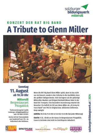 Wenn die Rat Big Band Hits von Glenn Miller spielt, dann ist das nicht nur ein Konzert, sondern eine Zeitreise in die Hochblüte eines der größten Swingorchester. Kein geringerer als der umtriebige gebürtige Mittersiller Musiker und Dirigent Reinhold bläst die Trompete in der Band. Eine besondere Inszenierung erwartet die Besucher. Ein Auftritt im Stil von Glenn Miller als "US Army Air Force Band" von 1943. In Original bzw. stilisierten Uniformen lässt die RAT Big Band das Publikum spüren, was sie erwartet. Bereits mit den ersten Tönen der Band taucht man ein in eine andere Zeit, in einer anderen Welt. Ob neben all den vielen großen Hits, wie Moonlight Serenade, In the Mood, Tuxedo Junction, St. Louis Blues Marsch, Pennsylvenia 6-5000. Reinhold Wieser ist es gelungen, die 18-köpfige Band auf Ihrer Tournee in seine Heimat Mittersill zu locken.