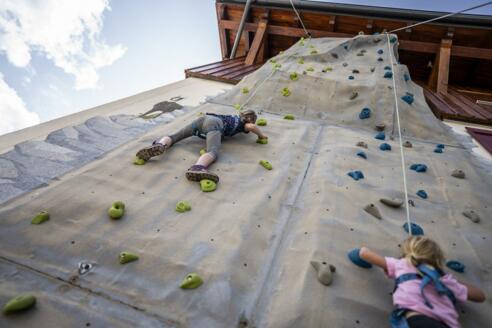 Wer sich schon immer einmal im Klettern versuchen wollte, sollte hier bei uns im Heidi-Hotel auf der 12 Meter hohen Kletterwand beginnen. Auf den farblich gekennzeichneten Routen geht’s hoch hinaus und man hat schnell den richtigen Griff heraus! Gesichert wirst du von einem unserer Kletter-Guides vom Boden aus. Das ist die sogenannte „Toprope-Sicherung“. Über eine Umlenkrolle hält der Guide dich an einem Seil, das an deinem Klettergurt befestigt ist. So kannst du jederzeit auch einmal eine Pause einlegen und wirst am Ende sicher wieder auf den Boden abgeseilt.