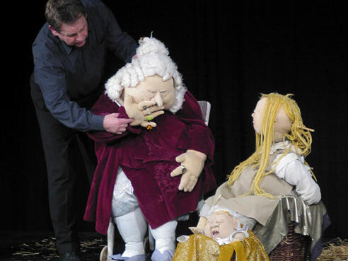 Es spielen mit: große Textilfiguren (lebensgroß) und kleine Textilfiguren (vielleicht so lang wie eine Elle, ungefähr) und ein Erzähler (lebensgroß) und kluge Kinder (auch lebensgroß in etwa). Ansonsten spielen mit: einiges an Stroh und Gold und einige Mehlsäcke.