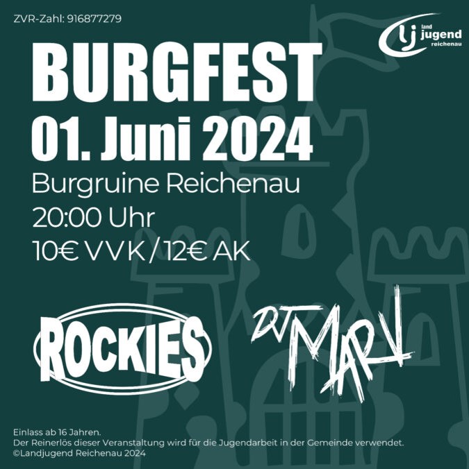 Schlossviertel 8, 4204 Reichenau im MühlkreisVVK: 10€AK: 12€Einlass um 20:00 UhrStay tuned!!Eintritt ausnahmslos ab 16 Jahren! Ausweispflicht!Der Reinerlös dient der Jugendarbeit in der Gemeinde.