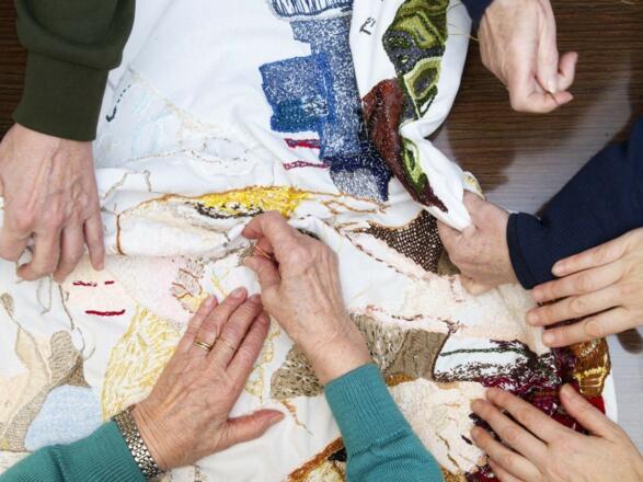 Während die Hände beschäftigt sind, können sich die Gespräche befreien. Genauso wie das Motiv von allen Mitwirkenden weitergestickt wird, spinnen sich die Geschichten weiter. Treffen für Treffen – Note für Note – Stich für Stich wächst die gesamte Stickerei als Summe jeder einzelnen Handschrift und Persönlichkeit.