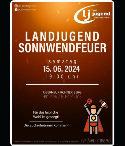 Landjugend SonnwendfeuerAuch heuer findet unser traditionelles Fest wieder am 15. Juni statt. Für unsere kleinen Gäste gibt es ein Kinderfeuer und einen Zuckerlmann und auch für das leibliche Wohl ist gesorgt.