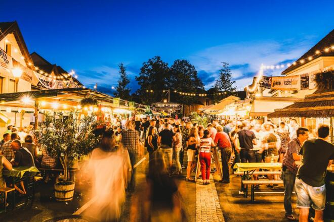 Gemütliche Heurigenatmosphäre auf dem liebevoll geschmückten Kleinhöfleiner Dorfplatz. Jeder der Winzerbetriebe verfügt über einen eigenen Schanigarten und bewirtet seine Gäste persönlich und mit viel Engagement.