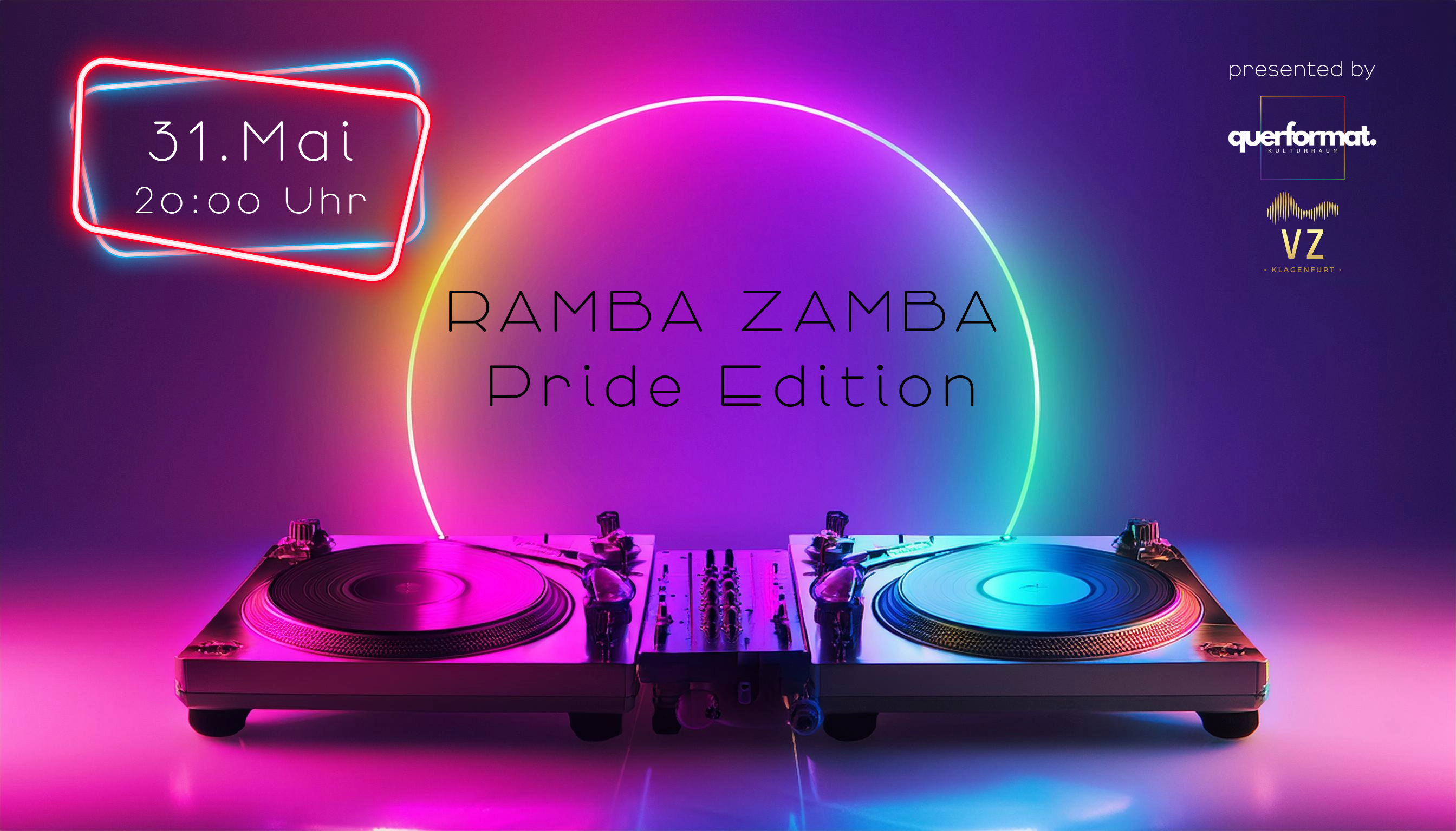 Mit Ramba Zamba start in den Pride Month. Der Kulturraum Querformat und das Veranstaltungszentrum Klagenfurt freuen sich auf eure farbenfrohen Pride-Outfits und kreativen Moves zu den technoiden Beats von Jenny & Stephi.