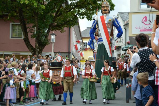 Es ist schon ein imposantes Schauspiel, wenn die mächtige Riesenfigur, der Samson, mit seinen beiden Zwergenbegleitern durch die Gassen getragen wird. Der Samson wird von der Trachtenmusikkapelle Mariapfarr begleitet, zu deren Musik er seine Ehrentänze vorführt.