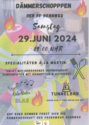 DÄMMERSCHOPPEN der FF Rennweg am Feuerwehr-Rüstplatz in Rennweg ab 19:00 Uhr.