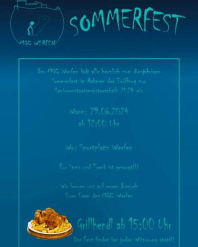 Der Minigolfclub Werfen lädt alle herzlich zum diesjährigen Sommerfest im Rahmen der Eröffnung zur Seniorenstaatsmeisterschaft 2024, ein. Das Sommerfest findet am Samstag, 29.06.2024, ab 12:00 Uhr am Sportplatz in Werfen bei jeder Witterung statt. Für Speis und Trank ist gesorgt, Grillhendl gibt es ab 15.00 Uhr. Auf zahlreiches Kommen freut sich das Team des MGC Werfen!