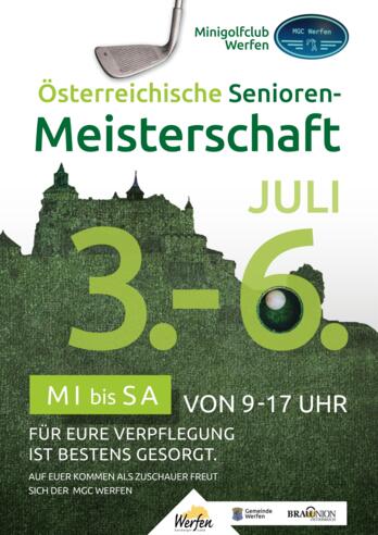 Österreichische Seniorenmeisterschaft von Mittwoch, 03.07.2024, bis Samstag, 06.07.2024, jeweils von 09:00 bis 17:00 Uhr bei der Minigolfanlage Werfen. Für die Verpflegung ist bestens gesorgt! Auf ein zahlreiches Kommen als Zuschauer freut sich der MGC Werfen!