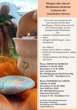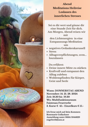Loslassen des innerlichen Stress zur Abendstunde. Im Multifunktionsraum der Feuerwehr. Kosten € 60,-/4er Block oder € 15,-/Einzelkurs. Bitte um Anmeldung.