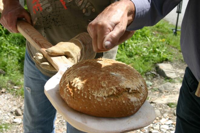 - 11.00 Uhr: Fertig gebackenes Brot der ersten Charge aus dem Backofen nehmen.